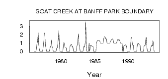 | PointID: | 243 | Code: | 05BC008 | Latitude (decimal degrees): | 51.05 | Longitude (decimal degrees): | -115.43 | Drainage Area (km2): | 40.90 | Source: | Hydat | Hydrological Zone: | Nelson | Name: | GOAT CREEK AT BANFF PARK BOUNDARY |